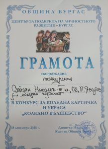 Учениците от ЦОУД |||“г“ клас, с ръководител г-жа Ваня Стоянова, участваха с голямо вдъхновение в конкурса и благотворителната инициатива за коледна картичка и коледна украса „Вълшебство на Коледа“, организирани от Община Бургас и ЦПЛР – гр. Бургас.