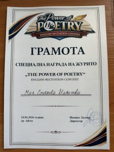 На 24.04.2026г.  се проведе конкурс за рецитация на поезия на английски език под надслов „The Power of Poetry“, организиран от СУ „Никола Вапцаров“ – гр. Айтос. Събитието събра талантливи ученици, които впечатлиха журито с артистичност, езикови умения и емоционално представяне.
