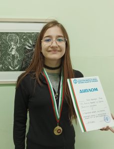 Ния Иванова от 7. б клас спечели първа награда в раздел „Рисунка“ с впечатляващата графика „Пазителят на дълбините“.