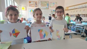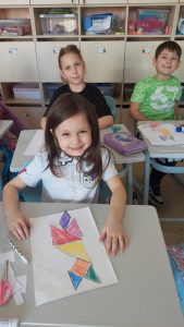 В часовете по ФУЧ – математика учениците от 1. Б клас с класен ръководител г-жа Пепа Борисова се запознаха с древната китайска логическа игра танграм. Чрез работа със седемте геометрични фигури – триъгълници, квадрат и успоредник – първокласниците създадоха разнообразни композиции по образец и по собствен замисъл.